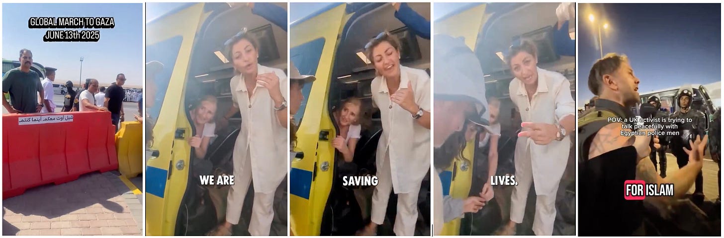 Hot on the heels of this, a band of geographically astute crusaders arrived in Cairo with the plan of entering Rafah via Eilat. Crying Welshmen, plump-lipped women, and other BBC lovers continue not to understand why the laws of Egypt should apply to them. At one point they were corralled behind plastic traffic barriers in really hot weather. Sometime after that they were made to sit on a bus and told they would be deported. The police should be grateful to these Westerners for instructing them on how to be good Muslims but they apparently have no humanities degrees. On the other hand, their barbaric ignorance has meant a wealth of photo ops for the March to Gaza and illustrates once more why we need to abolish passports.